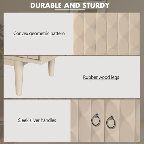Where bold design meets everyday function. Add sculptural elegance and smart storage to your home with this TREXM modern 4-door sideboard. Designed with a convex geometric door pattern, sleek silver handles, and almond-toned MDF, this piece blends beautifully into any living room, dining area, or kitchen. With adjustable/removable shelves and strong rubberwood legs, it delivers durability, customization, and standout style.